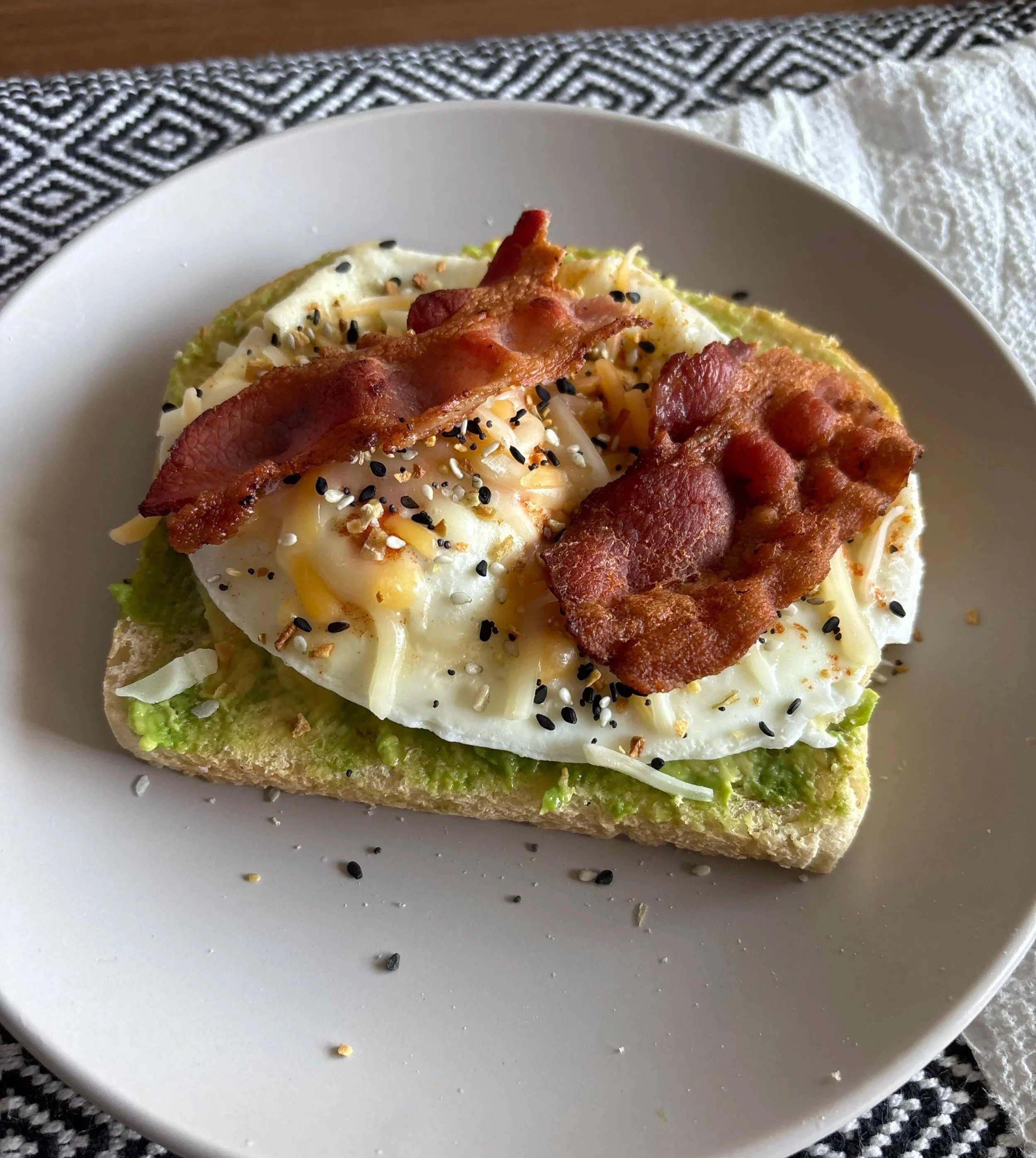 I will typically include eggs, bacon, hash browns, and avocado in my breakfast burritos (plus ketchup on the side, of course). My avocado toasts will typically have an over-medium egg, bacon, shredded cheese, and everything but the bagel seasoning.