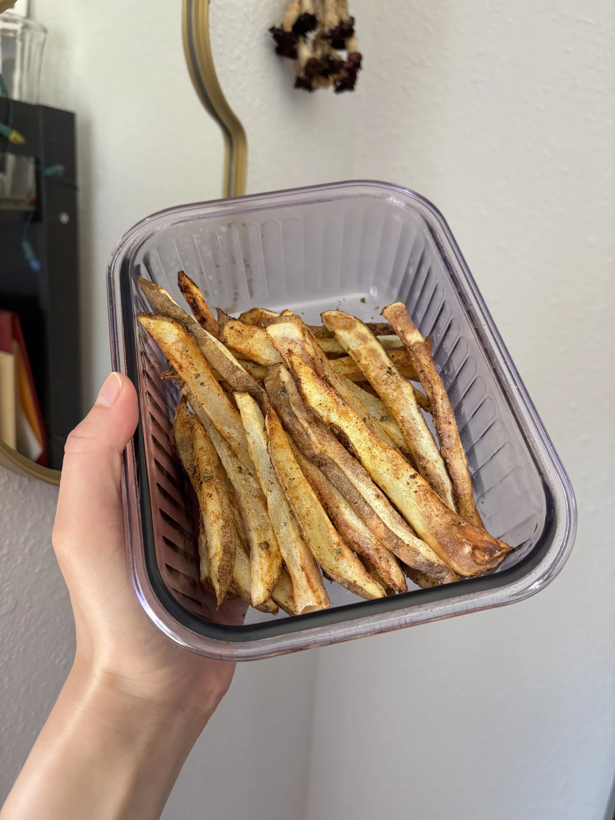 I recently got an air fryer (very late to the game, I know!!) and started making my own french fries! They taste so yummy and are very filling. They are the perfect low-effort snack that can be cooked with low supervision. I like to make these during my breaks when I work from home, so I can multitask and work on other chores or rest and enjoy my breaks.