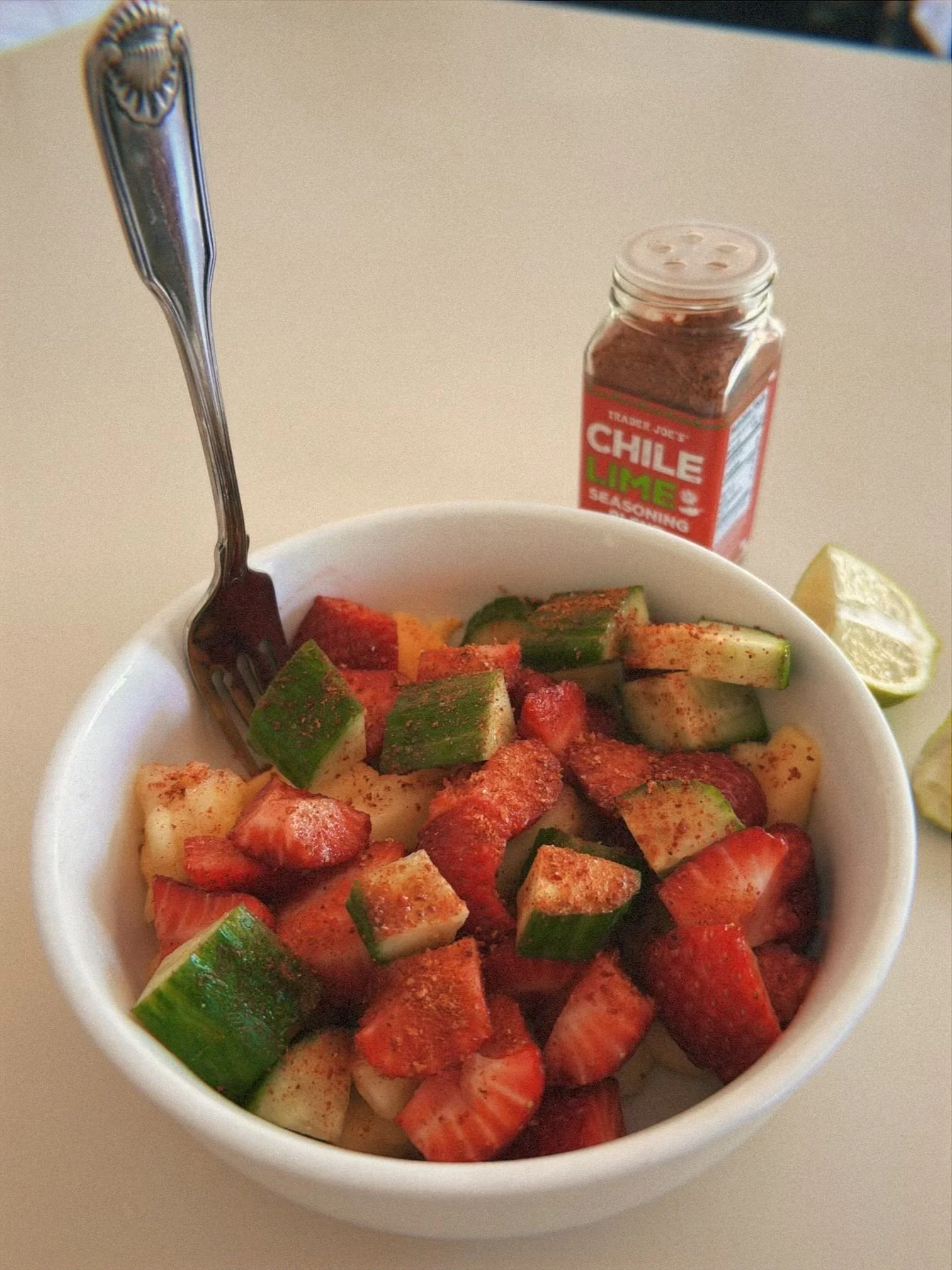 This is definitely not a new snack discovery by any means, but I have been really enjoying cups of fruit with Tajín (or any chile lime seasoning) and a squirt of lime! So refreshing, light, and delicious! You can use any fruit available on hand, but I have enjoyed my bowls with mangoes, pineapples, strawberries, watermelon, and cucumber. Best of all, I feel reconnected to my Mexican roots with each bowl.