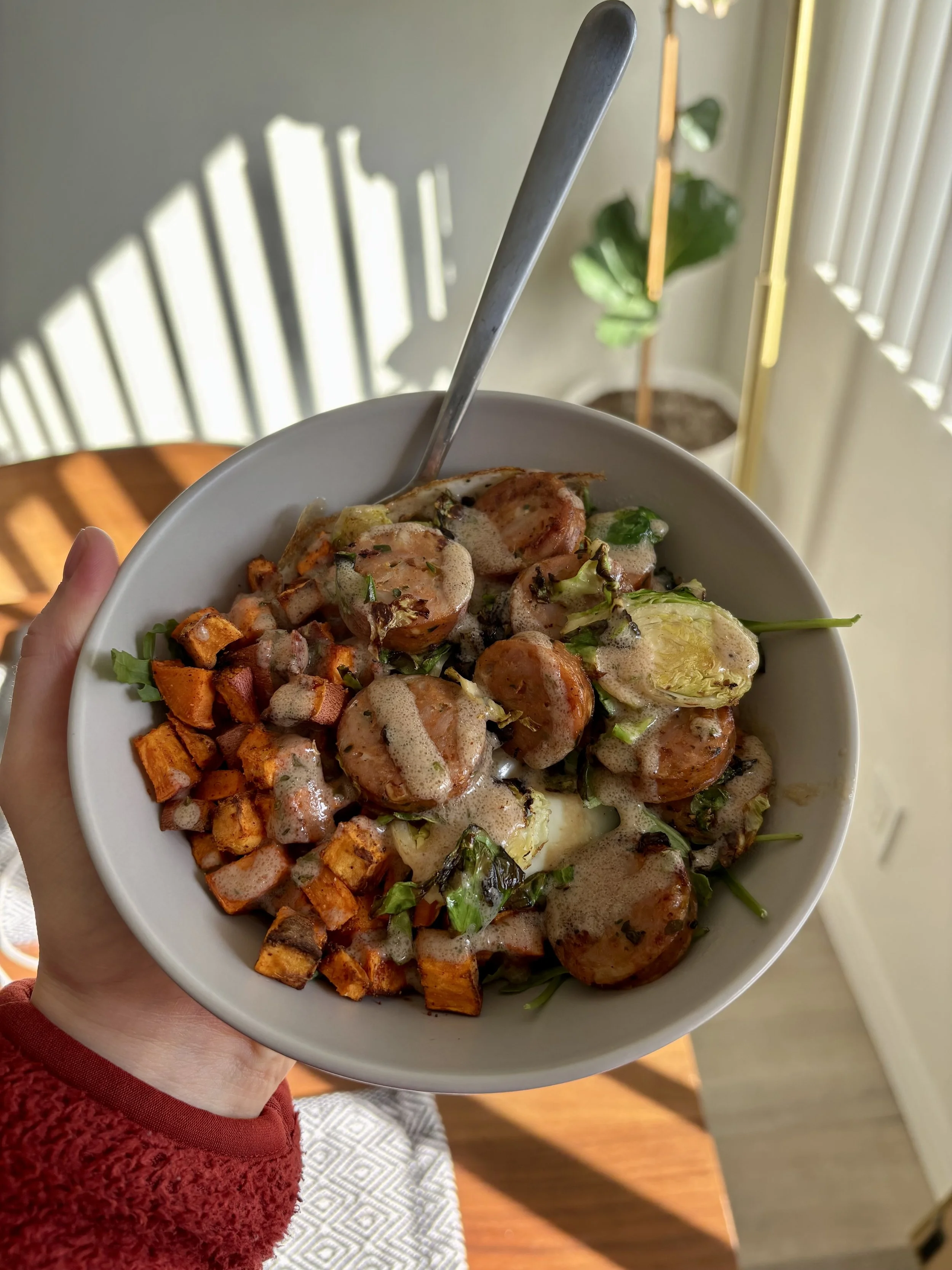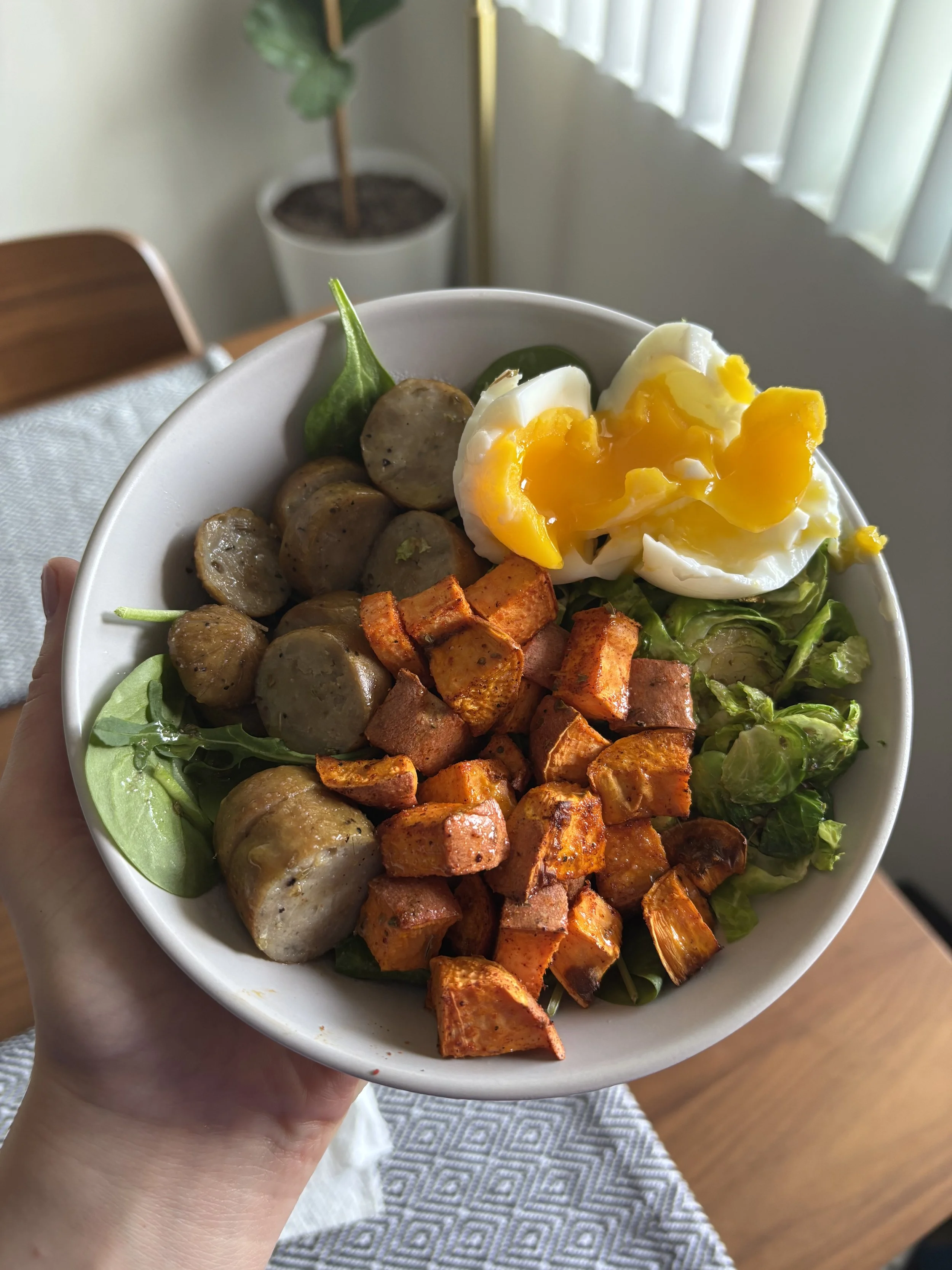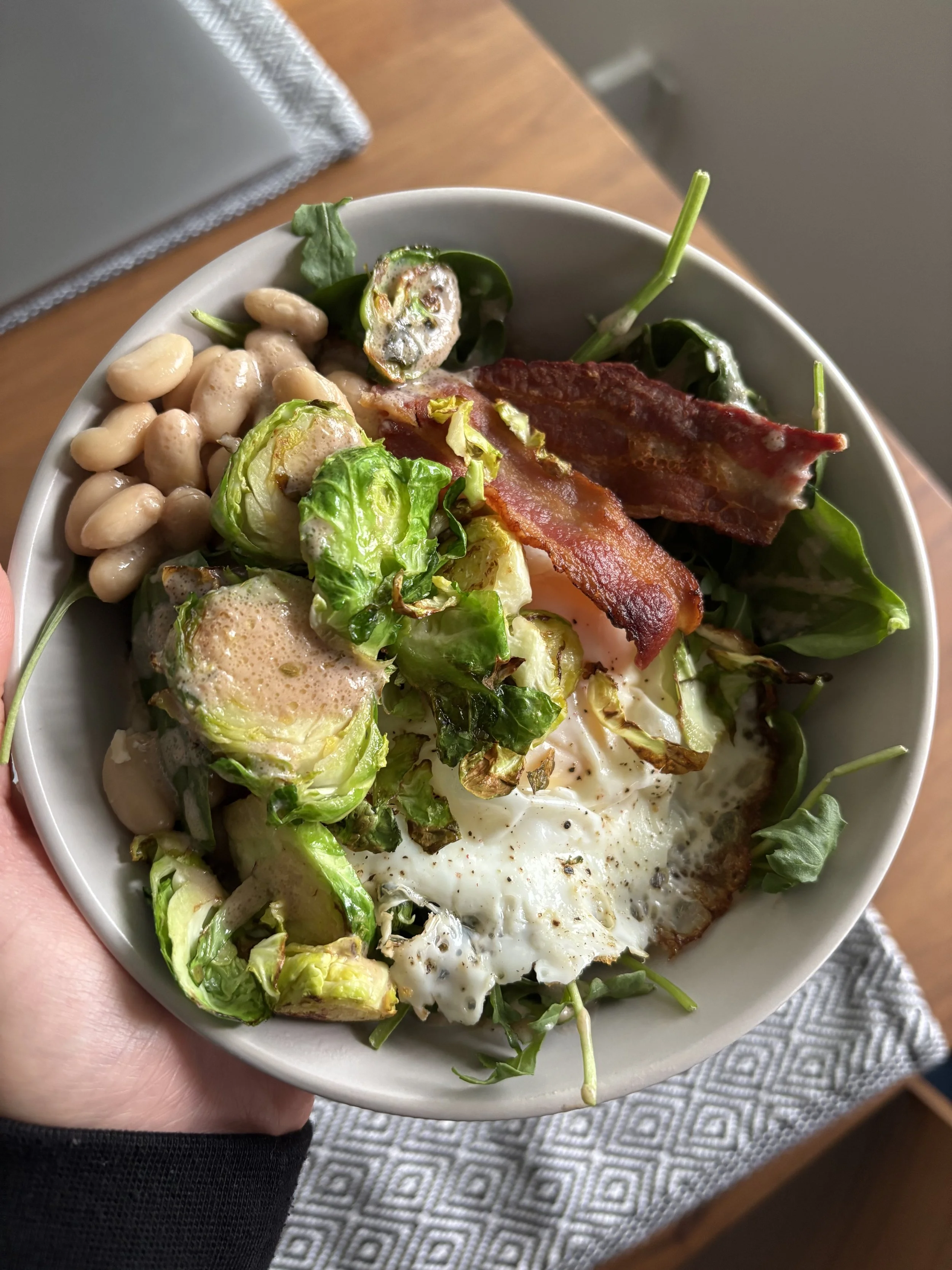 I like to include some combination of hard-boiled eggs, Brussels sprouts, sweet potatoes, white beans, chicken sausages, arugula, and spinach. I also make my own salad dressing, using olive oil, red wine vinegar, salt, pepper, oregano, and Dijon mustard. The dressing, combined with the salad ingredients, is chef’s kiss. The acidic kick of the dressing pairs well with the brightness of the arugula, too. I now make this breakfast daily!