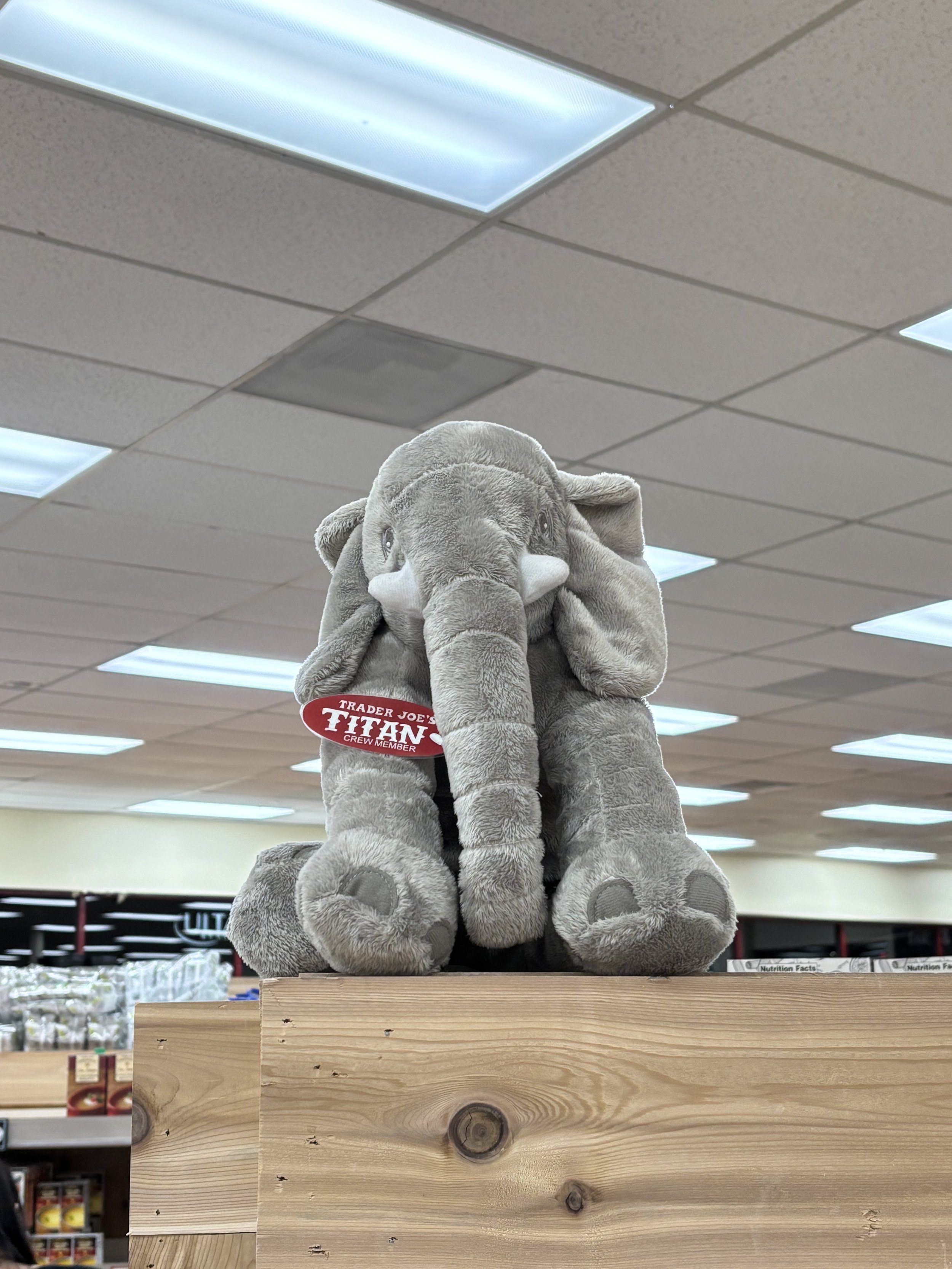The one at my local TJ’s is named Mandy. I visited a TJ’s near CSU Fullerton once and found their mascot, Titan, a stuffed elephant plush. This is a homage to the school’s mascot, Tuffy Titan, of the same animal variety.