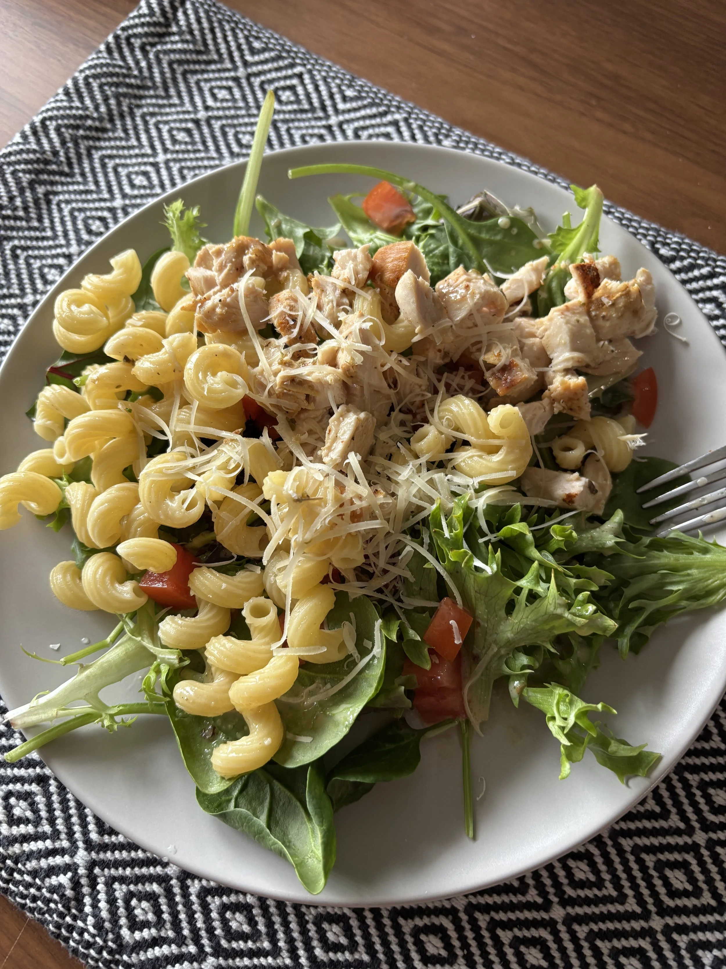 While trying to figure out what lunch to make with all of my leftover ingredients one day, I ended up making a delicious pasta salad. I included lettuce, spinach, chicken, cavatappi pasta (the pasta shape is crucial, in my opinion), tomatoes, and shaved parmesan. I made the same salad dressing that I make for my breakfast bowls, too (I have the recipe memorized).